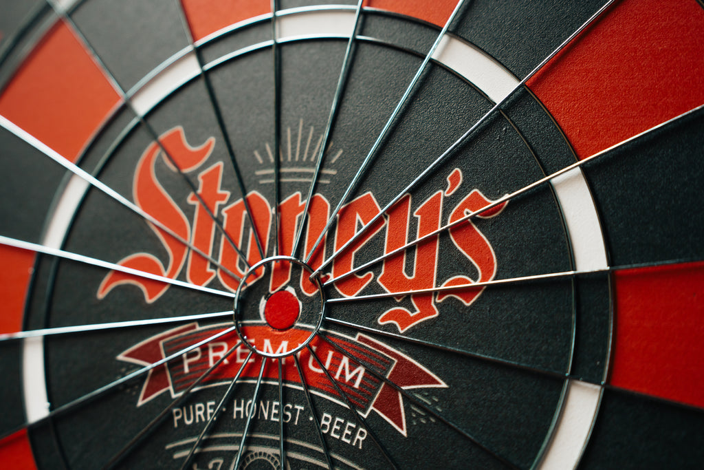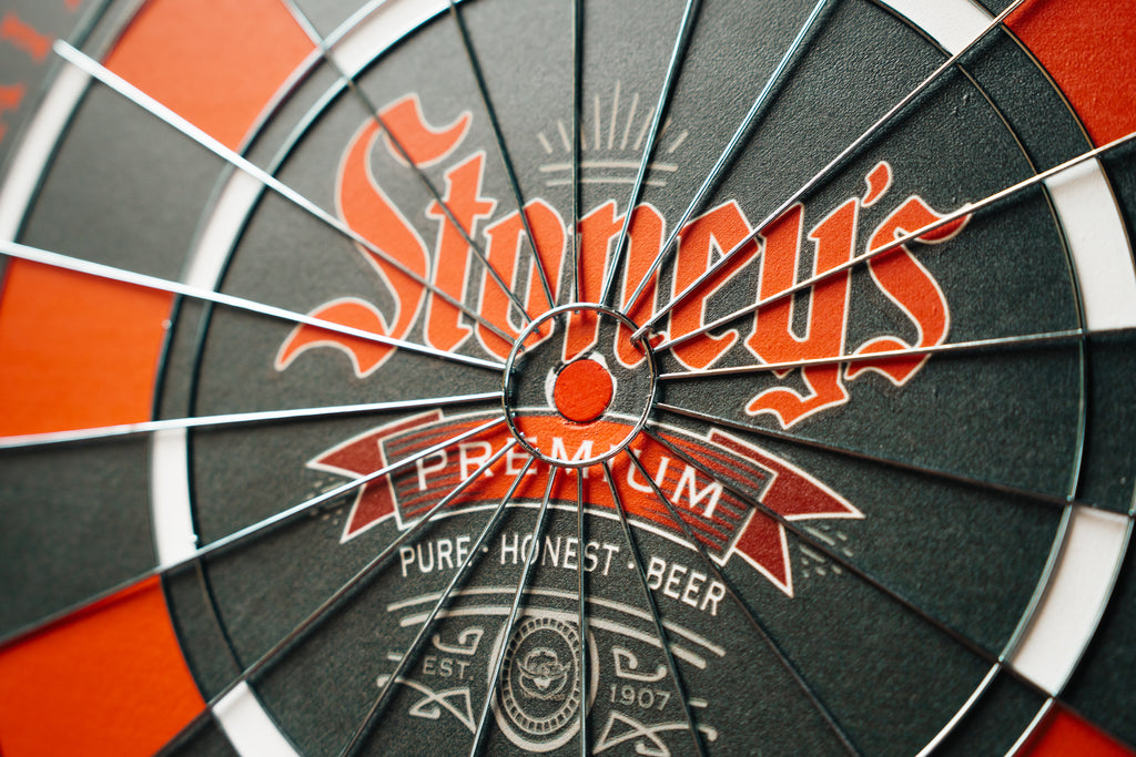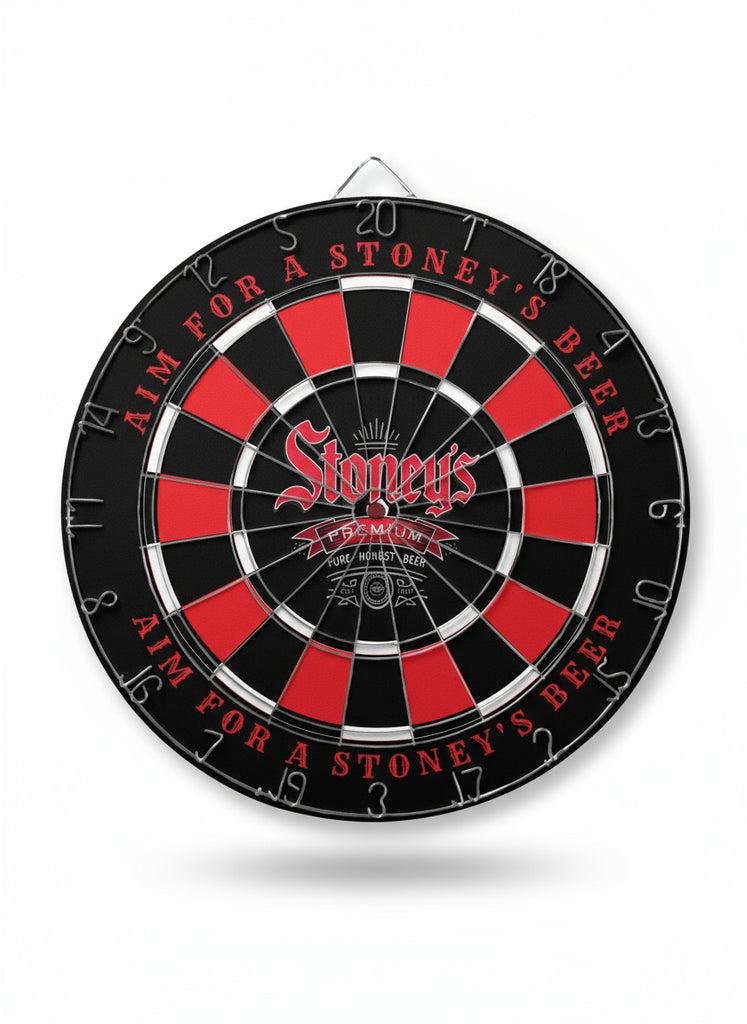 Bring pub-night energy to your game room. The Stoney’s Regulation Dartboard pairs a tournament-standard 18" face with vibrant, full-color printing and a clean aluminum frame. The included hanging hook makes setup quick, and the set ships with red metal-tip darts. Built for repeat play, the board’s bold red/charcoal segments and Stoney’s center mark look sharp in any space.